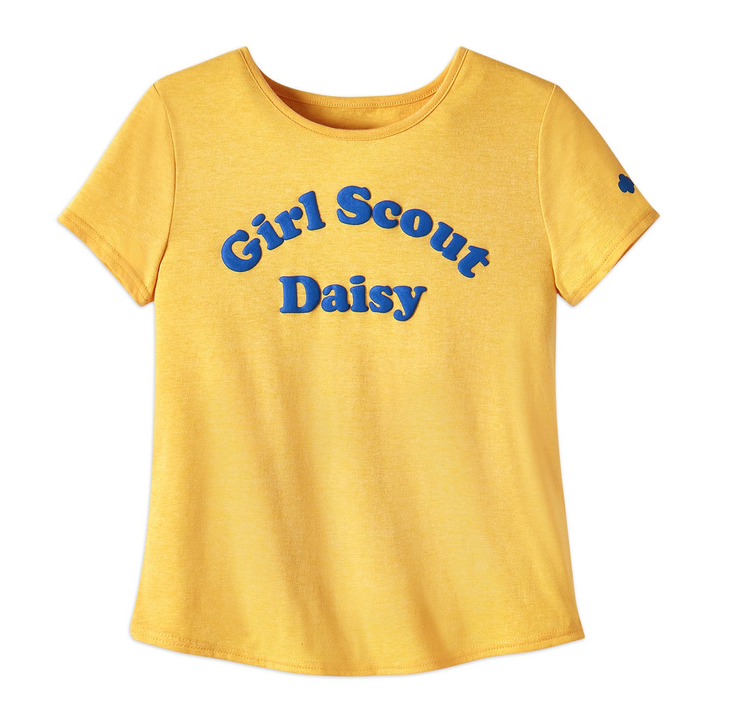 Stay golden in this cheerful tee! Made of super soft jersey knit recycled polyester, it’s comfy enough to wear around the house or on-the-go. Style it tucked into the Daisy skort or paired with our slim knit pants. Designed with your Daisy uniform in mind, this gold tee has a curved hem, blue accents, and a fun 3D puff print trefoil on the sleeve to show your Girl Scout spirit, even under your vest or tunic. Features “Girl Scout Daisy” print in blue. Traditional fit. Cotton (60%) and recycled polyester (40%) jersey knit. Imported.